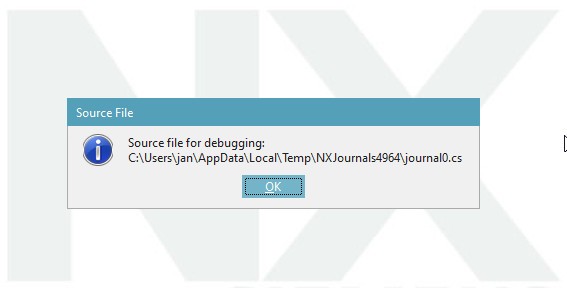 Die Methode kopiert das ursprüngliche Journal, versieht es mit den richtigen Zeilenumbrüchen und benennt es um. Danach wird die Programmausführung mittels eines Dialoges angehalten. Die im Dialog angezeigte Quellcodedatei kann vom Anwender in Visual Studio geöffnet und nach Bedarf mit Breakpoints versehen werden. Abschließend muss der Debugger an den NX-Prozess (ugraf.exe) angehängt und das Programm durch Bestätigen des Dialoges fortgesetzt werden.
