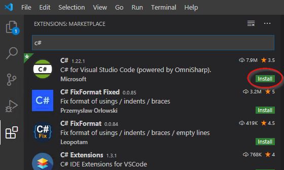 Details zur Verwendung von VS Code finden sich z.B. hier5. Die C# Erweiterung für VS Code kann aus dem Programm heraus installiert werden.