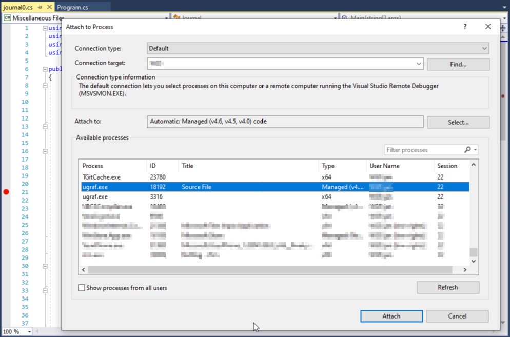 Assuming that the original journal from NX is copied unchanged into the temporary directory, the source code can be restored from the original file. The name of the source code file must match the name of the assembly. Additionally, the copy may only be made when the program is already being processed. Now the source code file can be opened in Visual Studio or another debugger and the debugger can be connected to the NX process.