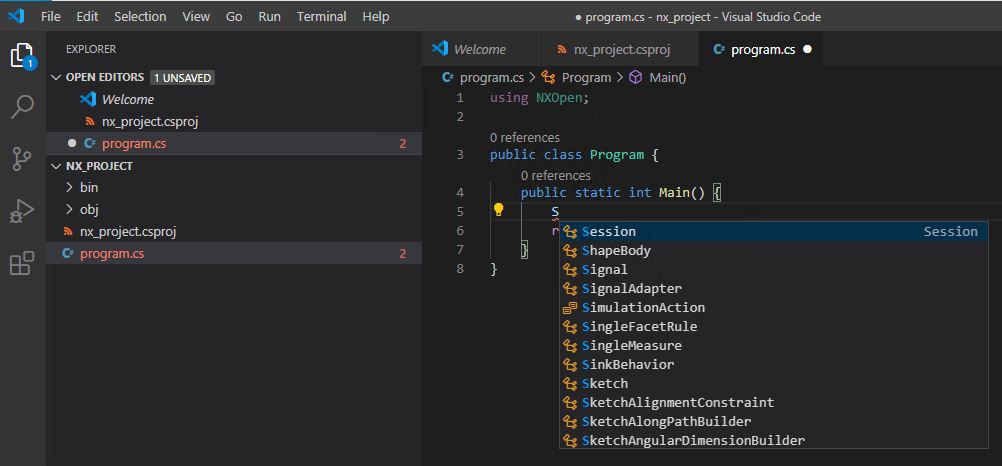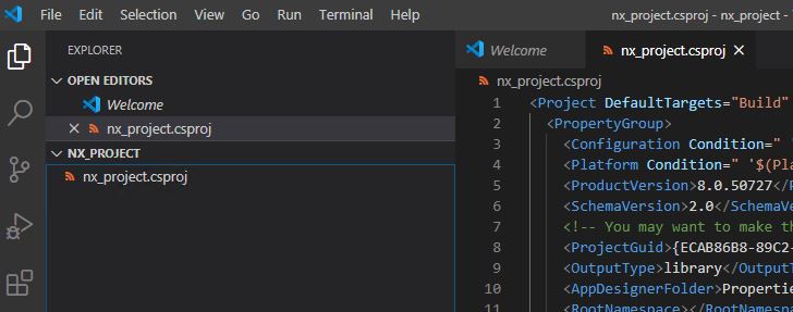 The project file required for a working IntelliSense and compilation must be created by hand. The template file of the wizard from the NX installation can serve as a template (<UGII_BASE_DIR>\UGOPEN\vs_files\VC#\VC#Wizards\ NXOpen_VCS\Templates\1033\default_dll.csproj). The extension of the new file must be csproj.